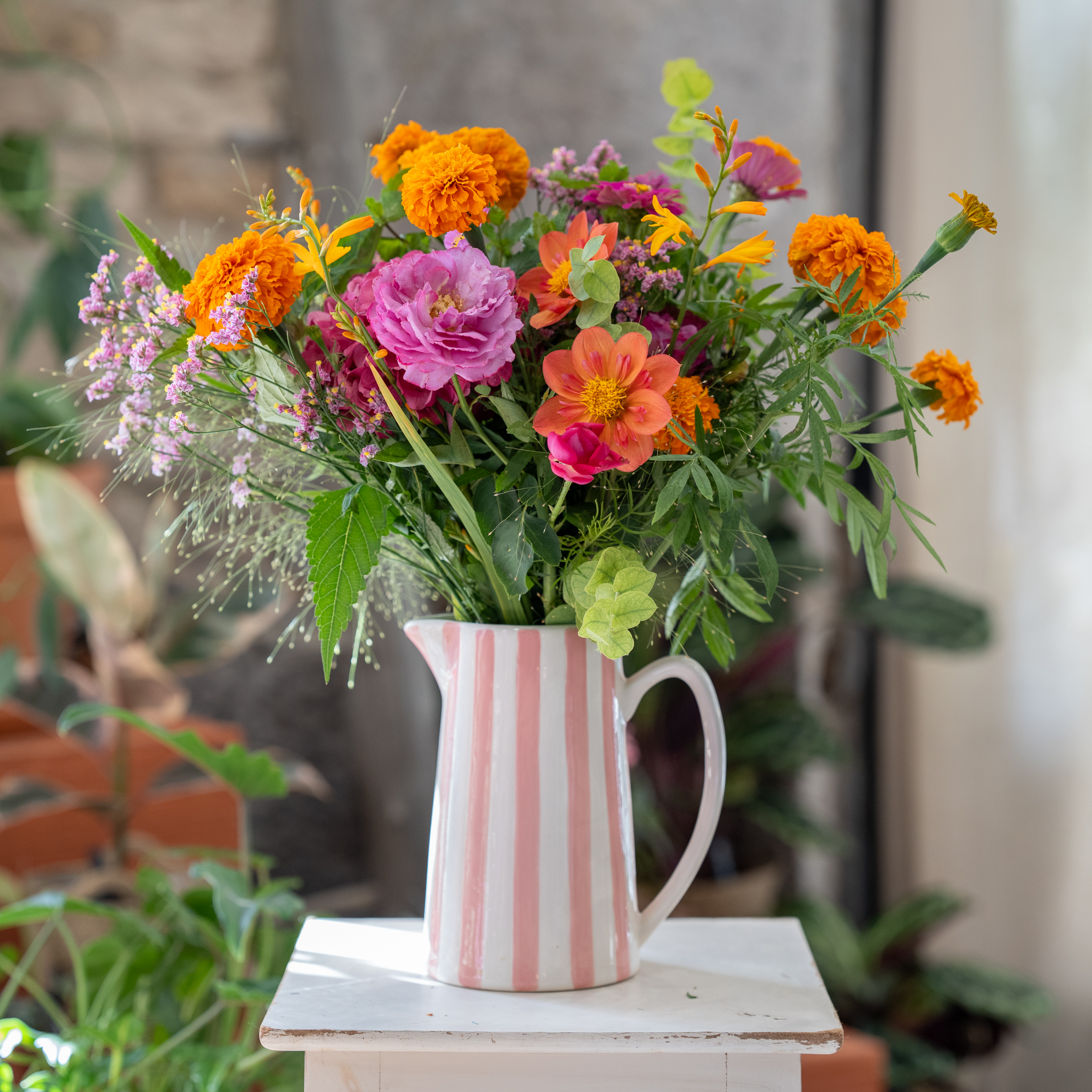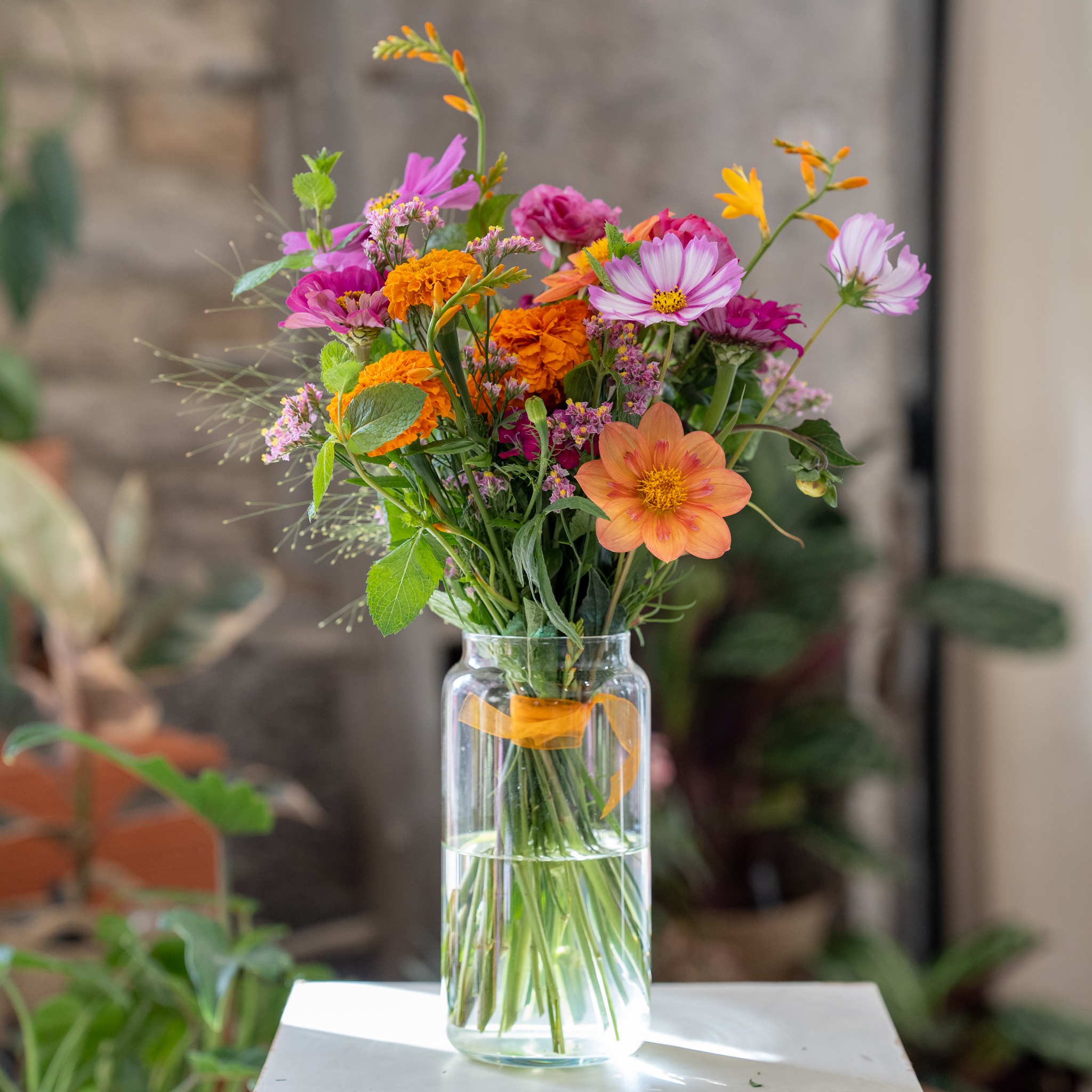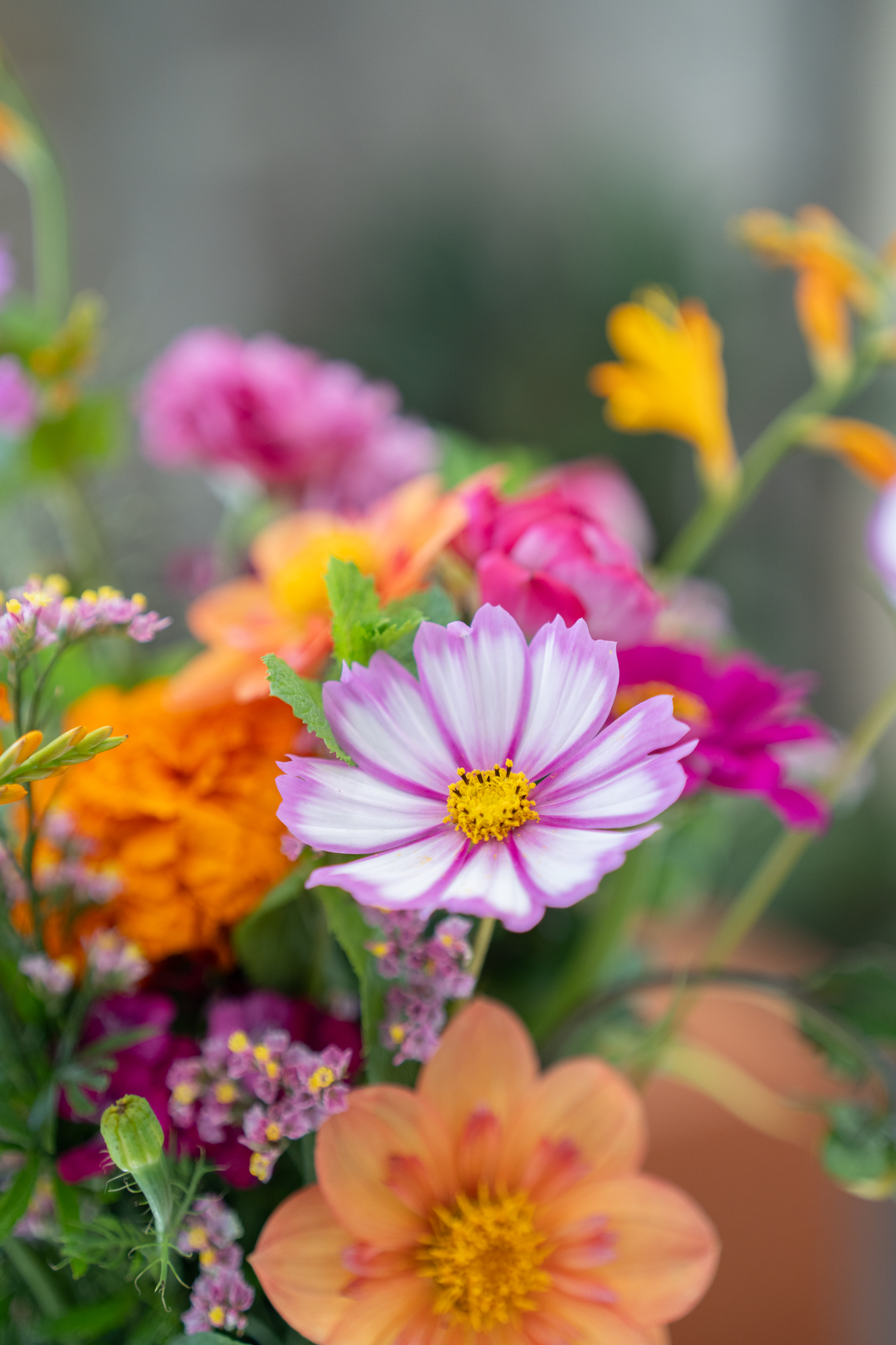 Bouquet de fleurs de saison aux couleurs vives et contrastées.